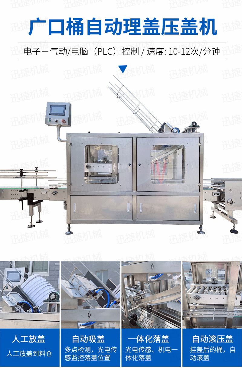 自動(dòng)理蓋壓蓋機(jī)可以完成自動(dòng)完成理蓋、壓蓋、輸送進(jìn)瓶、輸送出瓶等一系列操作,設(shè)備采用機(jī)械式原理,電機(jī)驅(qū)動(dòng),具有工作穩(wěn)定可靠,操作簡(jiǎn)便,生產(chǎn)效率高,適用范圍廣等特點(diǎn)。廣泛應(yīng)用于各種規(guī)則的玻璃、塑料材質(zhì)的圓瓶、方瓶的壓蓋,是日化、化妝品、醫(yī)藥、食品等行業(yè)的理想壓蓋設(shè)備。