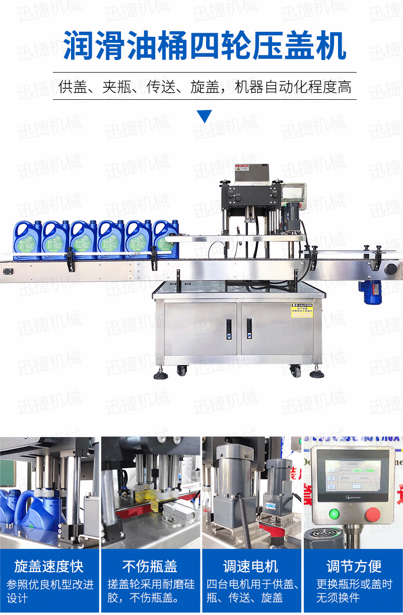 4.我們采用分系統(tǒng)動(dòng)力控制及供料,提升了灌裝速度;以1L為例,4頭灌裝機(jī)每小時(shí)可達(dá)到1000桶/小時(shí);灌裝在提升灌裝范圍的同時(shí),對計(jì)量方式進(jìn)行了改進(jìn),大大提高了灌裝精度,誤差1‰以內(nèi)。5.灌裝頭獨(dú)有的雙重防滴漏,灌裝下料口設(shè)計(jì)精細(xì),行程短,同時(shí)也提高了整條線的灌裝速度和灌裝精度,保證在正常灌裝過程中一滴油都不會滲漏。