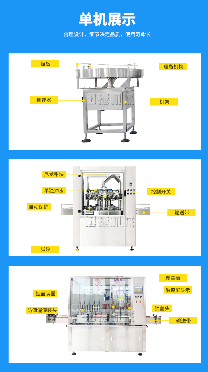 公司主要經(jīng)營(yíng)兩大類產(chǎn)品:灌裝機(jī)和包裝機(jī)。其中灌裝機(jī)主要產(chǎn)品有:食用油灌裝機(jī)、液體灌裝機(jī)、膏體灌裝機(jī)、自動(dòng)灌裝機(jī)、全自動(dòng)灌裝機(jī)、辣椒醬灌裝機(jī)等;包裝機(jī)產(chǎn)品有:粉劑包裝機(jī)、顆粒包裝機(jī)、液體包裝機(jī)、自動(dòng)包裝機(jī)、真空包裝機(jī)等。