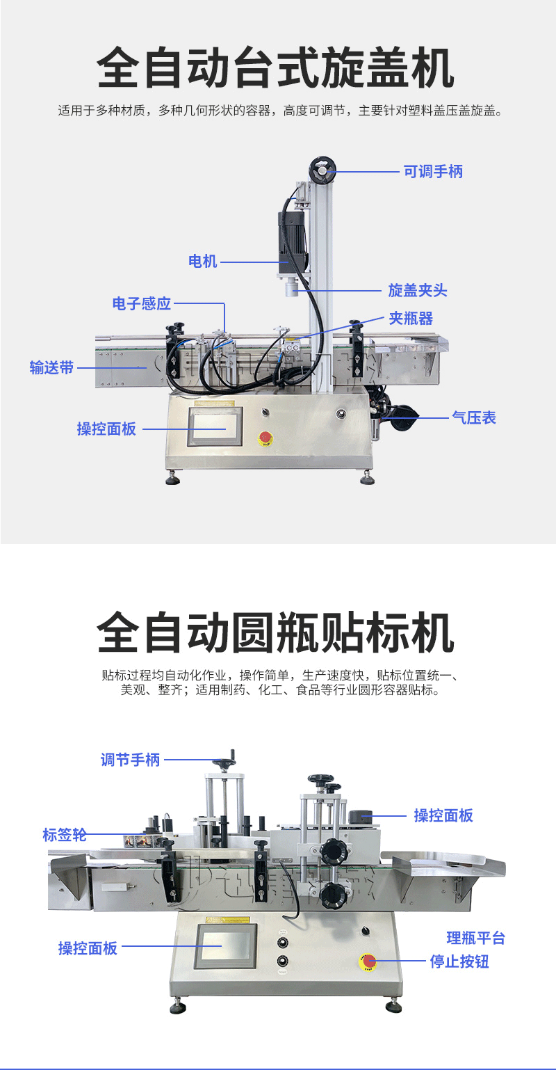 產品說明:生產線根據灌裝范圍選擇型號,灌裝部分為雙頭下潛式灌裝機,適用于不同物料不同瓶子的灌裝,配備自動壓蓋機和圓瓶貼標機,可實現不同蓋子的旋蓋貼標工作。